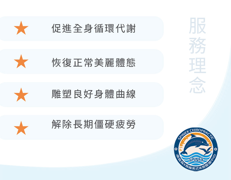 首創 C.P.C.T. 體態平衡整復技術,並搭配正面、背面、側面三張照片進行體態評估,是全台首家依據拍攝照片評估客人體態姿勢的專業店家。 我們結合 美式體態整復鬆動技術與 Thompson 湯普森整復床技術,透過專業的體態評估與整復調理,幫助全身恢復正常、舒緩身體僵硬與維持良好曲線,打造健康美麗的體態。