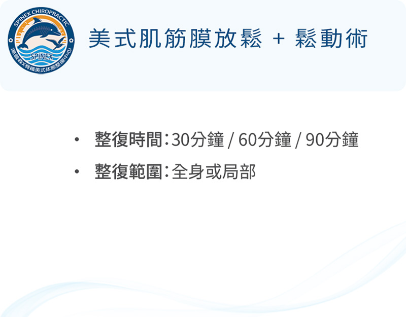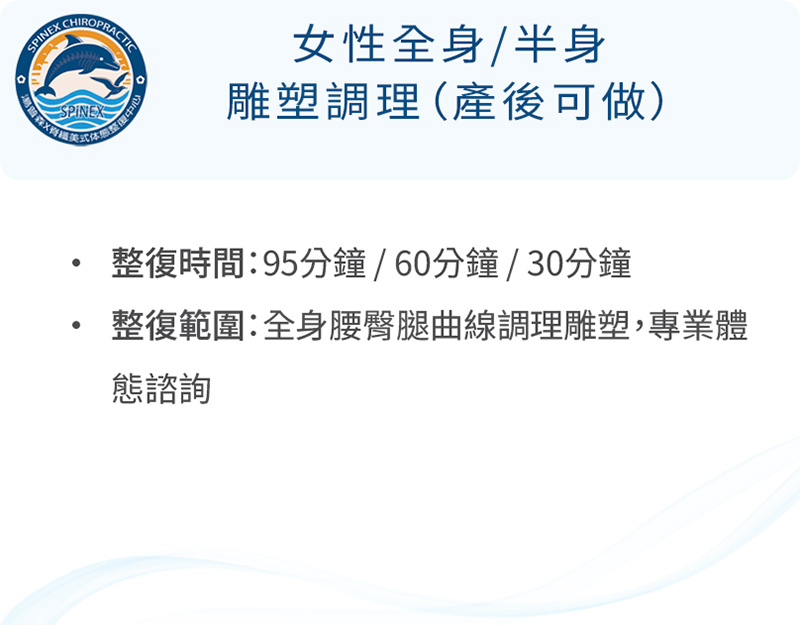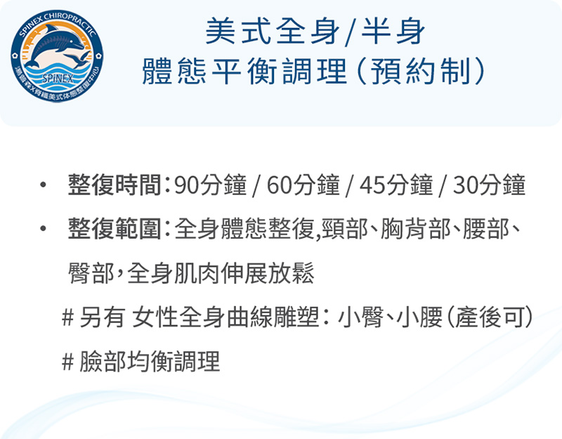這是一套結合 Thompson 美式整復技術與 CPCT 體態整復技術的服務流程,強調透過專業評估,了解客戶的體態狀況,並依據個人需求,提供客製化的整復方案。其目標是恢復肌肉和體態的正常功能,進而達到雕塑健康曲線的效果。★★★★★服務流程與特色: ★專業評估: 首先由專業技術人員進行詳細的評估,了解顧客目前的體態狀況。 技術應用: 結合 Thompson 美式整復床技術與 CPCT 體態整復技術,這兩種技術在調理身體結構、改善歪斜排列、恢復肌肉彈性方面有其獨特的優勢。 ★個人化方案: 根據評估結果,量身訂製專屬於個人的整復調理方案。 紓解方式: 透過整復調理,幫助恢復肌肉的正常張力與身體的靈活度,解決可能因體態不良引起的僵硬或活動受限問題。 ★健康雕塑: 最終目標是透過調整身體的結構和均衡,改善健康,維持健康的身體曲線。 適用族群與效益: ★身體僵硬不適者: 可改善因姿勢不良或肌肉失衡引起的肩頸、背部、腰部等慢性問題。 ★體態不佳者: 有助於改善體態。 ★運動傷害後恢復者: 協助活動力和肌肉恢復正常功能,為運動表現打下良好基礎。 ★追求健康美者: 透過整復調理,維持好身體的比例和曲線,達到更健康的體態。